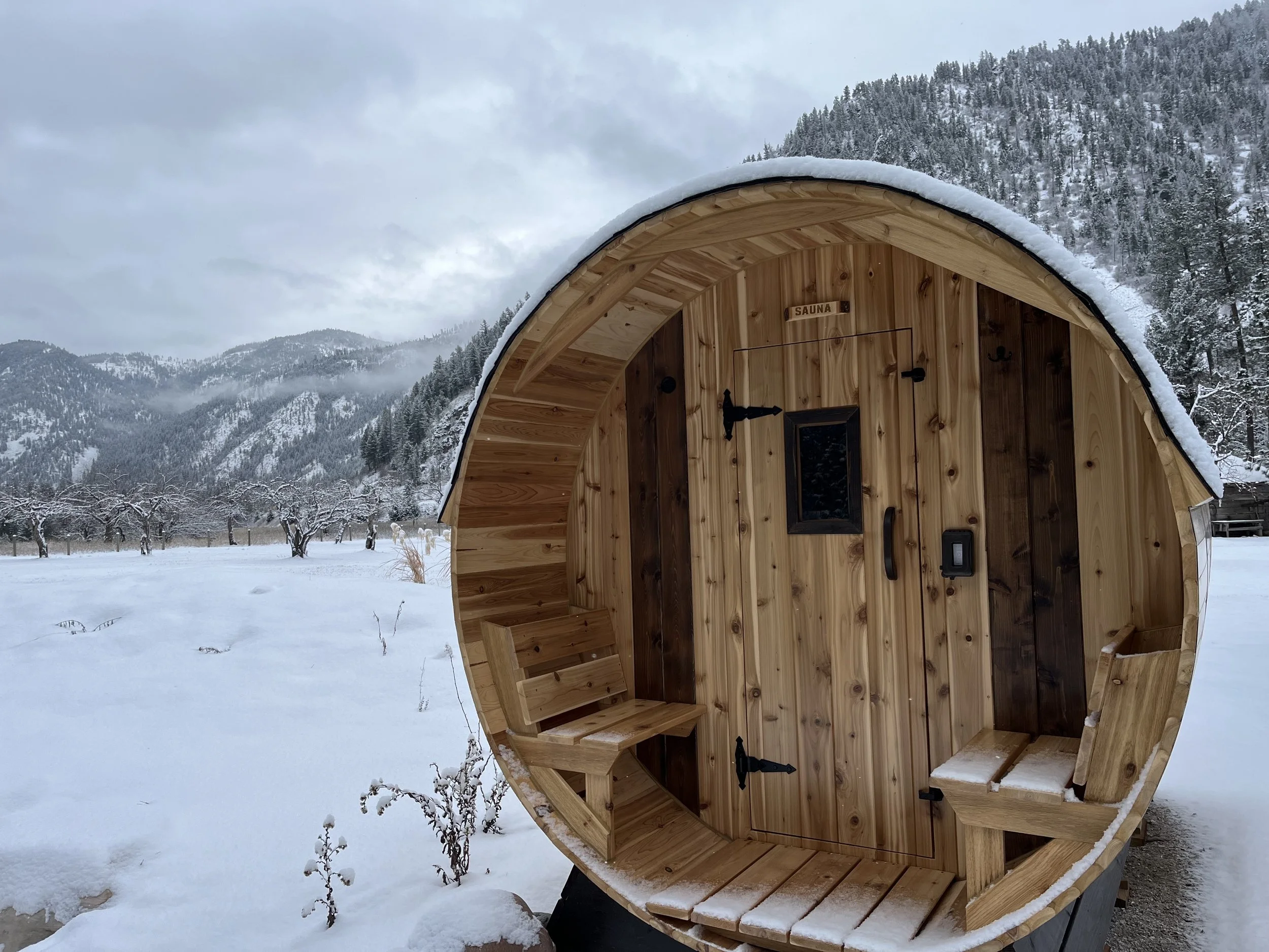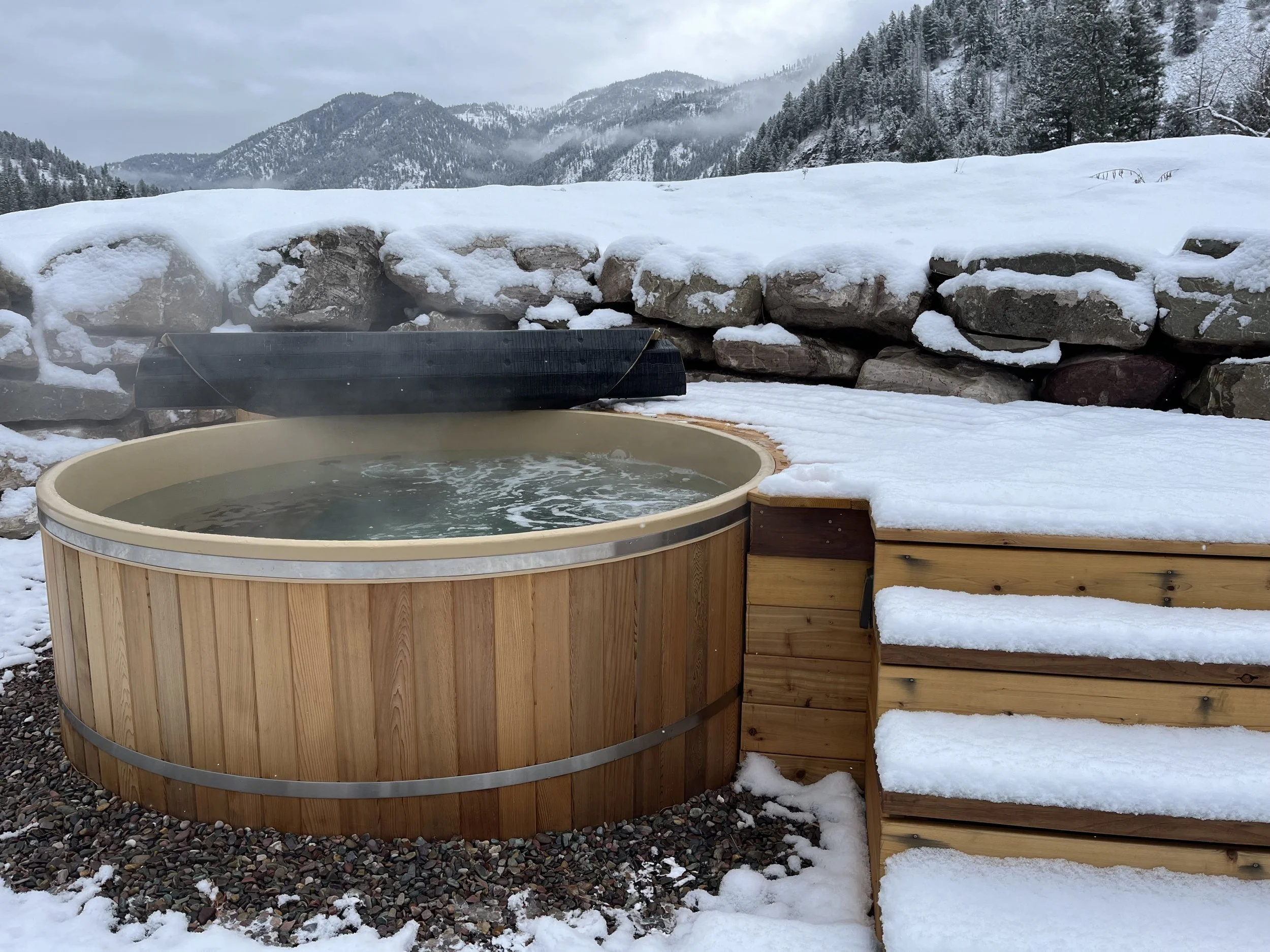 8 person cedar sided hot tub overlooking the Blackfoot River